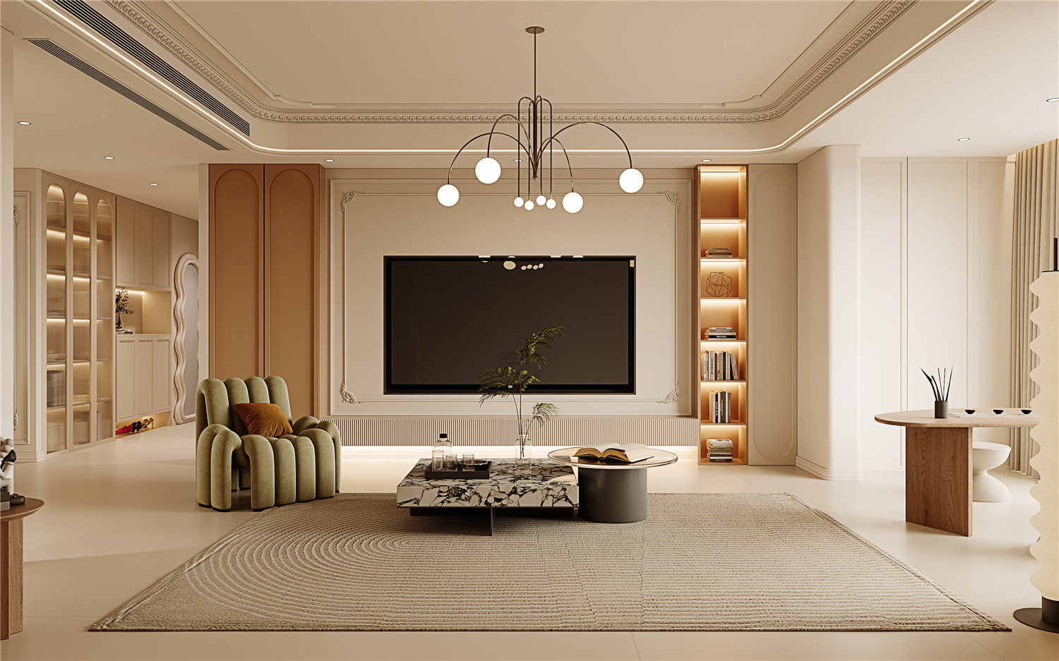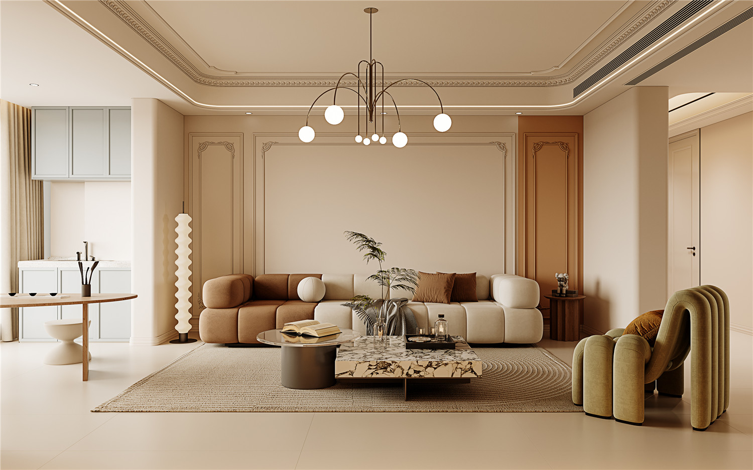 淡雅的奶油色在空间中悠然弥漫,轻柔地调和客厅的氛围,使之更显柔和与恬静,墙面则巧妙地运用拼色设计,结合经典的法式雕花与流畅线条,勾勒出丰富而独具匠心的纹理与层次 6686官方版app,为整个空间增添了一抹优雅与精致的气息。