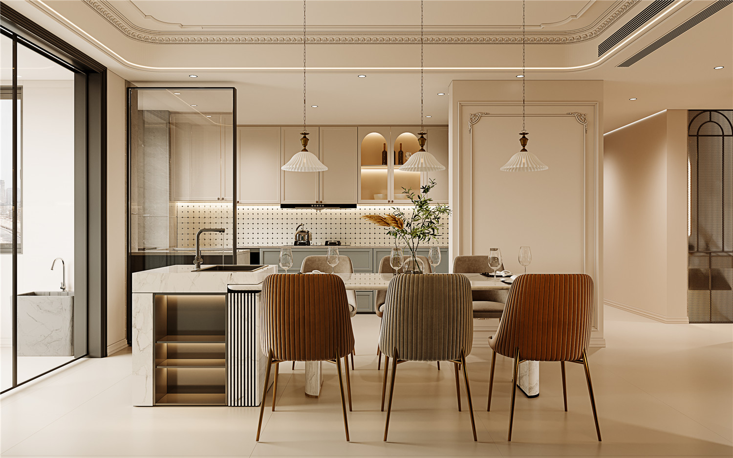 岛台旁,一列高挑的法式橱柜展现着非凡的气度,定制设计将恒温酒柜,管线机完美嵌入 6686官方版app,同时保留了充裕的收纳空间,让厨房用具井然有序,背景墙上,湖蓝色瓷砖如同法式庄园中的静谧湖泊,将用餐氛围渲染得更为宁静与优雅。