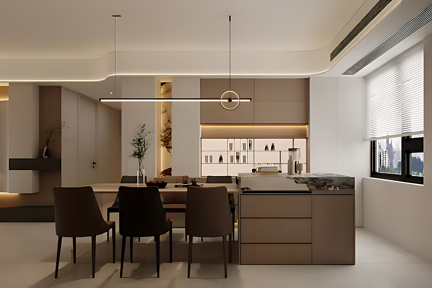 1,厨房改为开放式,与餐厅相连通 6686官方版app,增设餐边高柜与餐岛一体设计,以补充厨房功能。