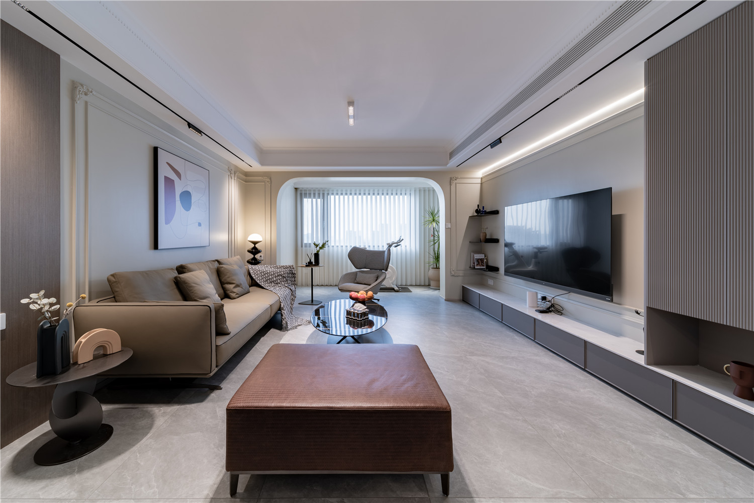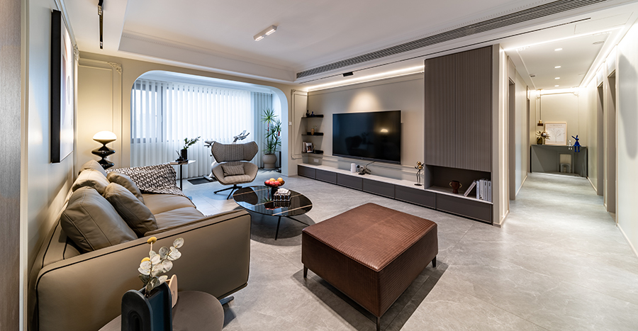 新华尚水湾这套137㎡的三居室住宅户型规整且采光好,原有功能分区上的劣势在于走廊过于狭长,容易给人以闭塞感,因此设计师充分利用户型优势,借助双阳台设计引进自然光,而走廊处则借用吊灯 6686官方版app,墙壁等设计提升丰富感,为便利主人日常起居生活,设计师在主卧区域改造出货一个迷你卫浴空间,以提升生活的私密感。