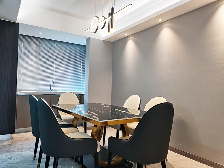 餐厅区域使用了与客厅空间一致的配色,以保障不同功能空间具有一定的衔接感 6686官方版app,符合人体功能学的曲线靠背桌椅让区域多了一抹现代美学感。