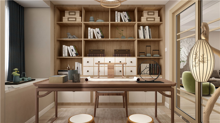 简约的书柜以及工作的座椅可以感觉到现代的气息,书房的灯也透露出来一种艺术感。