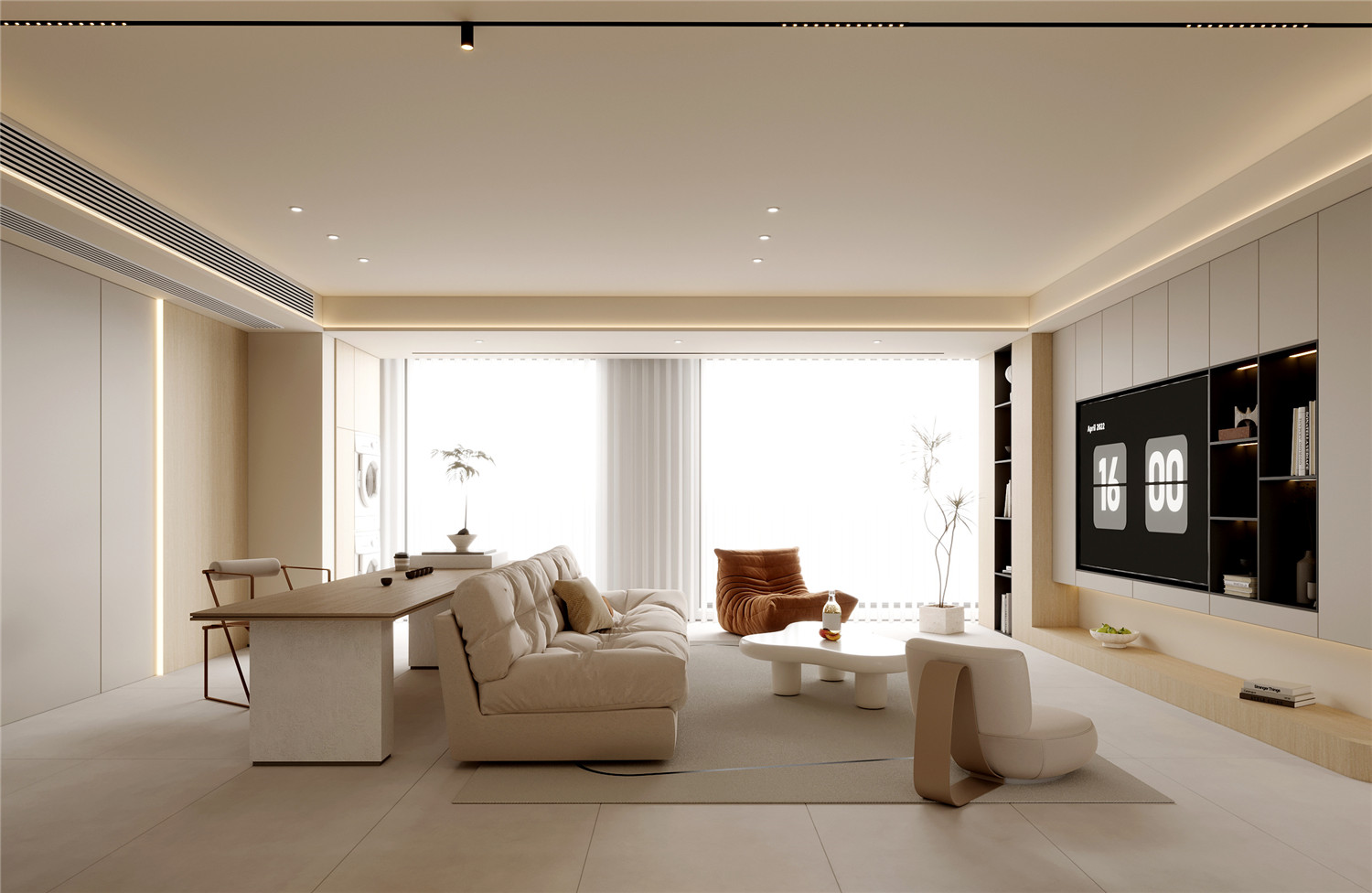 1 客厅电视背景柜做满整面墙体,使空间显得更整体,再用岩板点缀,更有特色。