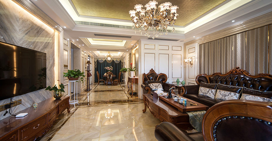 材质上以石材,木饰面为主,点缀金色线条,搭配上精致的水晶灯,营造出一种浪漫的气息,也极具生活品质,深色家具呈对称式分布 6686官方版app,与大的氛围和基调相和谐,低调有内涵。